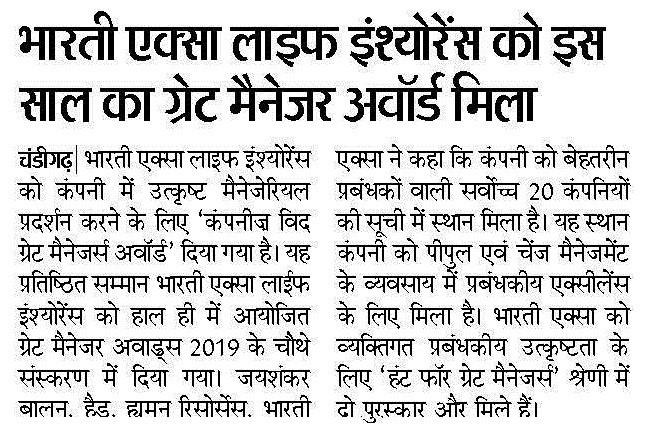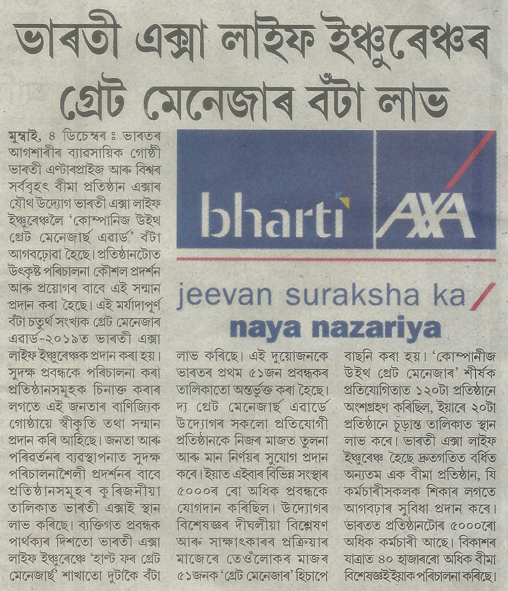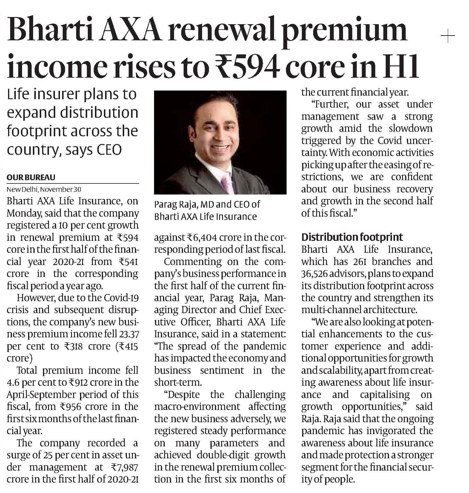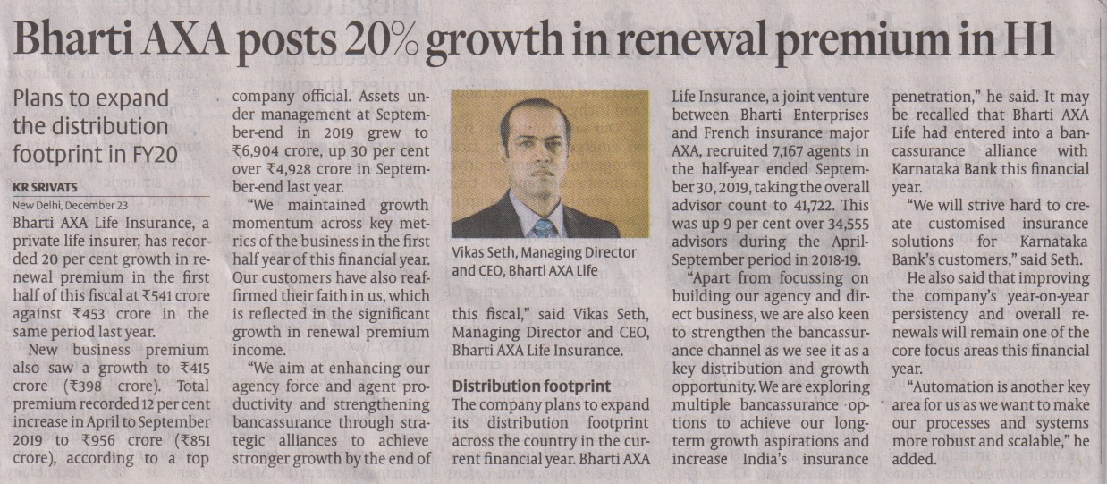 BHARTI AXA LIFE INSURANCE POSTS 20% GROWTH IN RENEWAL PREMIUM TO RS 541 CRORE IN H1 FY2019-20