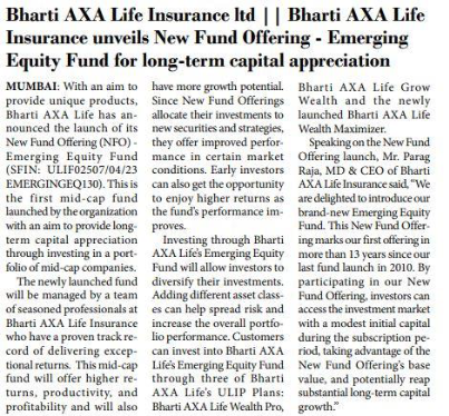 Bharti AXA Life Insurance unveils New Fund Offering - Emerging Equity Fund for long-term capital appreciation